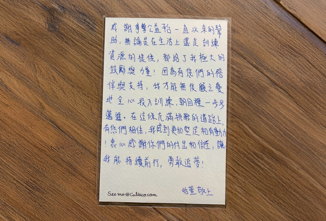2023 年開始獲得「拳勵飛翔計畫」支持後,她的訓練與生活壓力獲得顯著改善。這份支持不僅穩定了她的學習與生活,更讓她以更完整的準備站上更大的舞台,象徵「努力的孩子應該被看見,也值得被支持」。